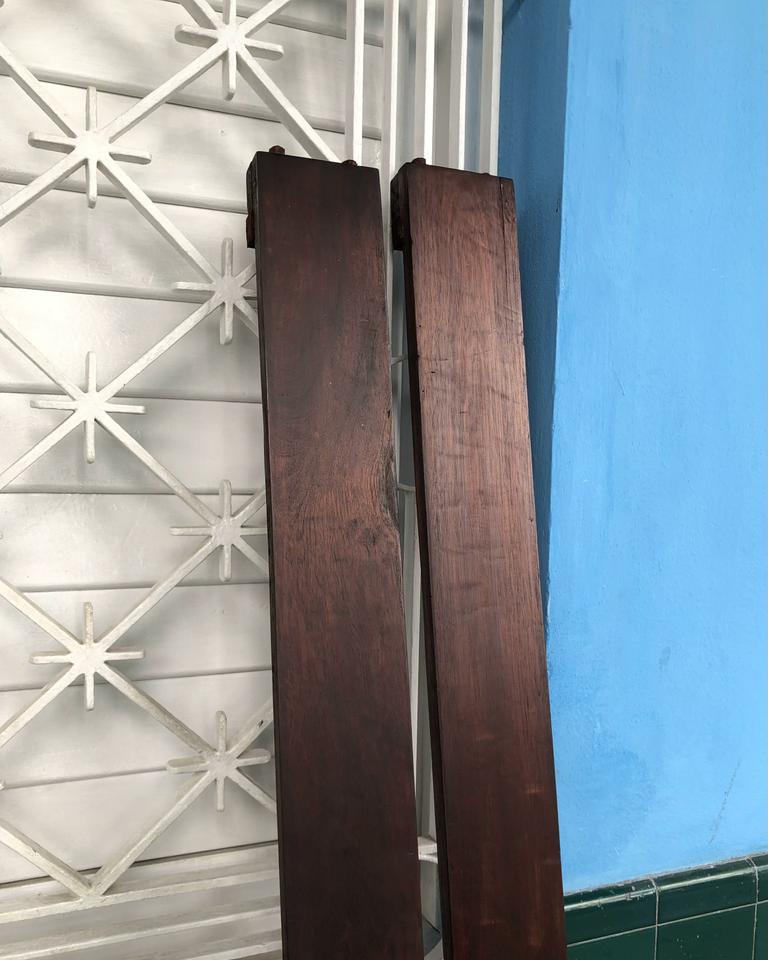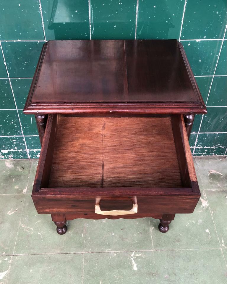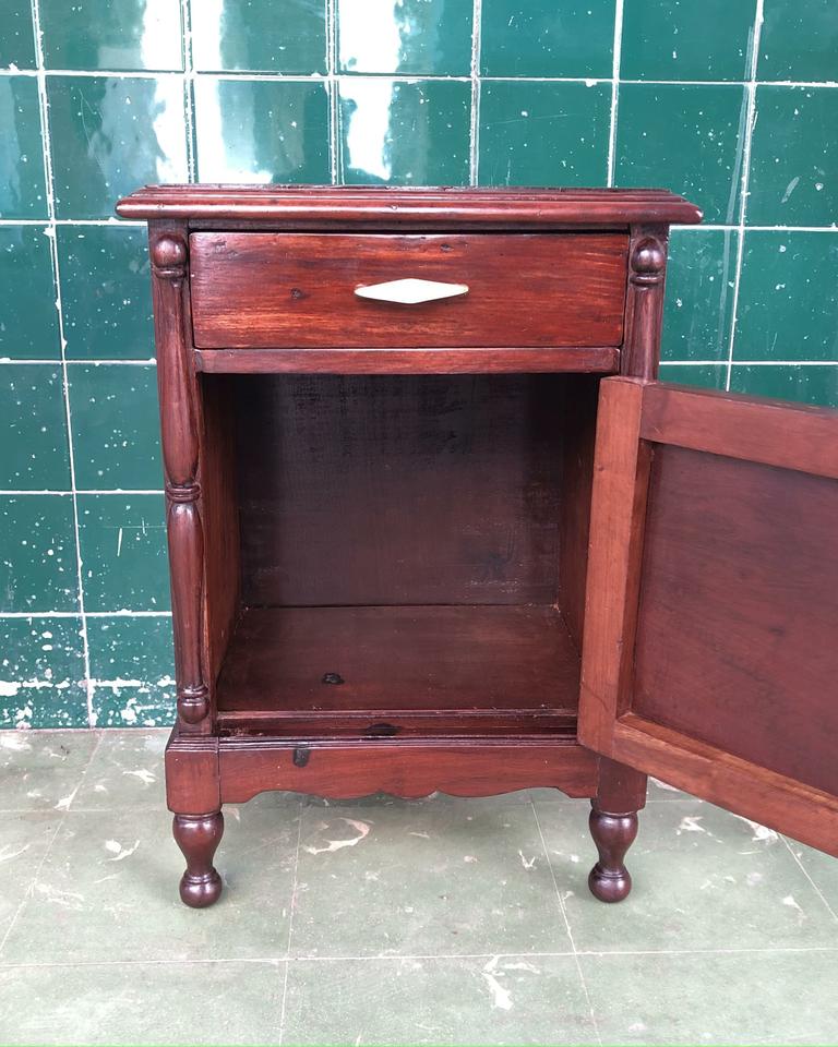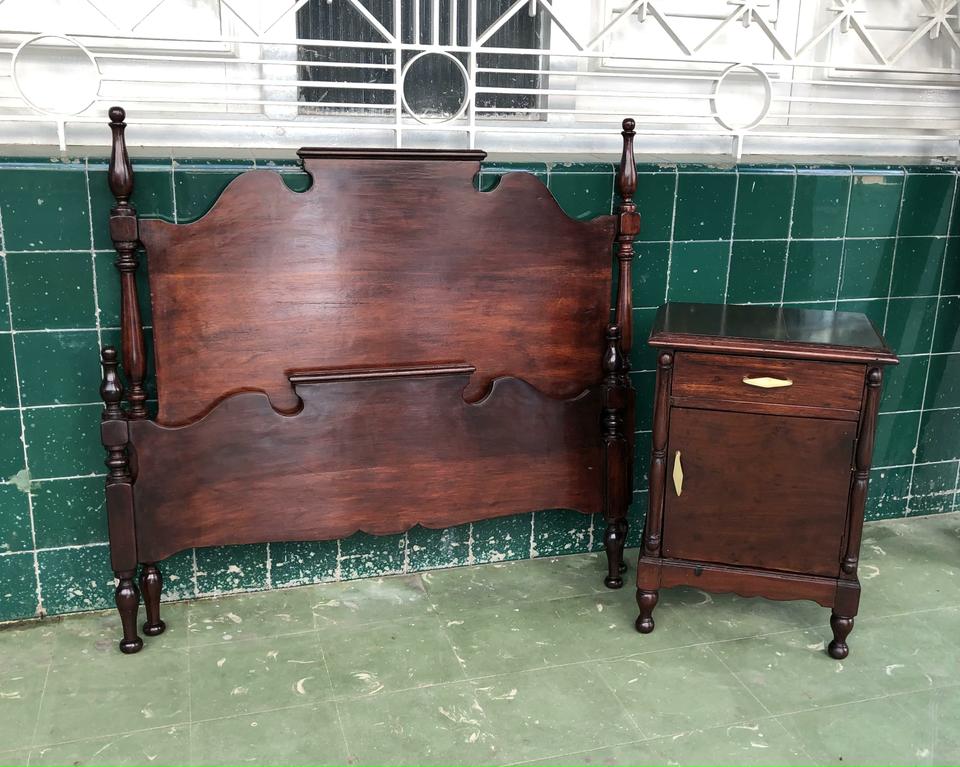 Cama personal estilo Colonial con una mesita de noche, acabada de restaurar. Tiene su bastidor de madera.