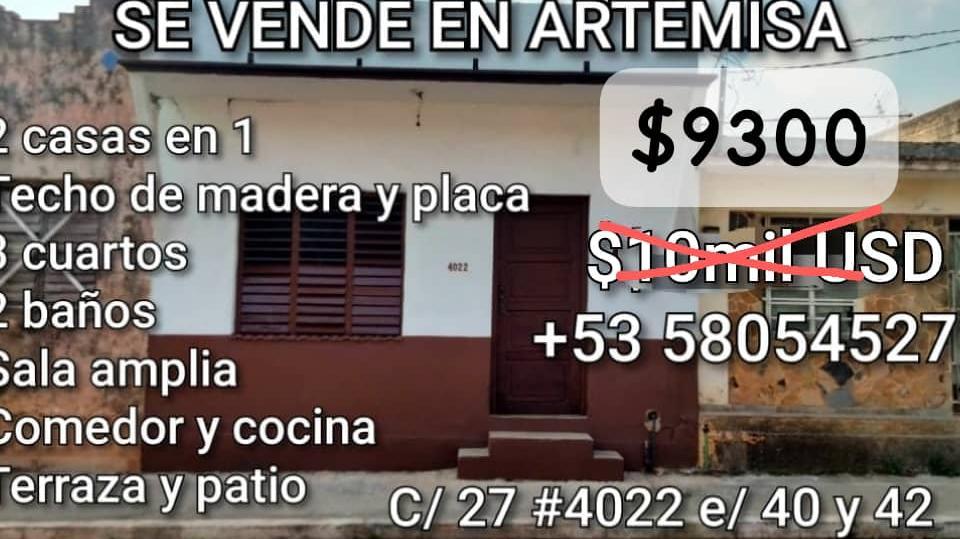 SOLO VENTA Casa grande SON 2 CASAS EN 1, de 3 cuartos amplios, 2 baños, sala grande, pasillo interior ancho, comedor, cocina, terraza y patio con espacio para ampliarle, cada una con su fosa independiente. Sin pasillos laterales. Muy importante agua 24 horas, barrio super tranquilo y con sus papeles en regla. Techo de madera y placa en buenas condiciones solo está falta de pintura o falso techo. Ubicada en el centro del pueblo de Artemisa a 3 cuadras del parque y Boulevard en el mismo Céspedes. C/ 27 #4022 e/40 y 42. NUEVO PRECIO $9300 USD. Contacto de la dueña +53 58054527