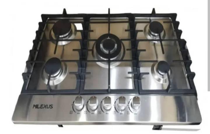 Las cocinas tienen 5 quemadores, son de las que se empotran en la meseta. Tenemos este modelo de la foto, color acero inoxidable y también las hay en negro.