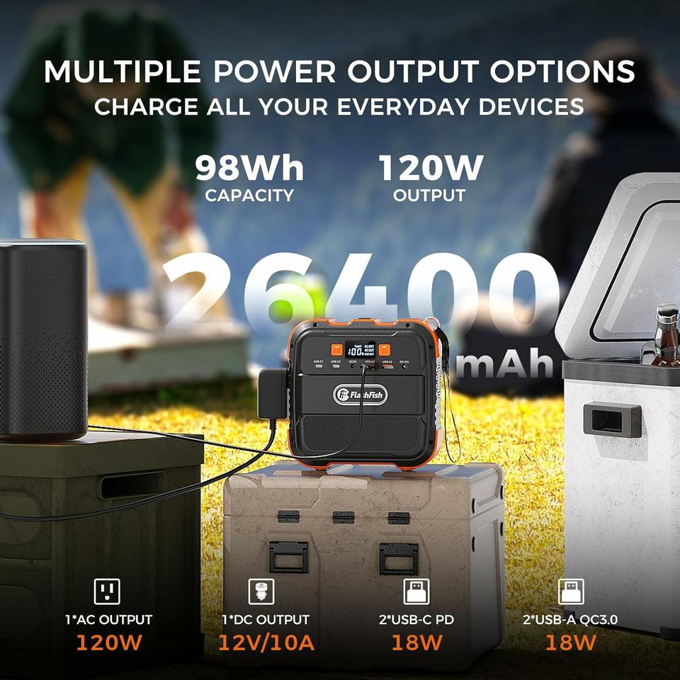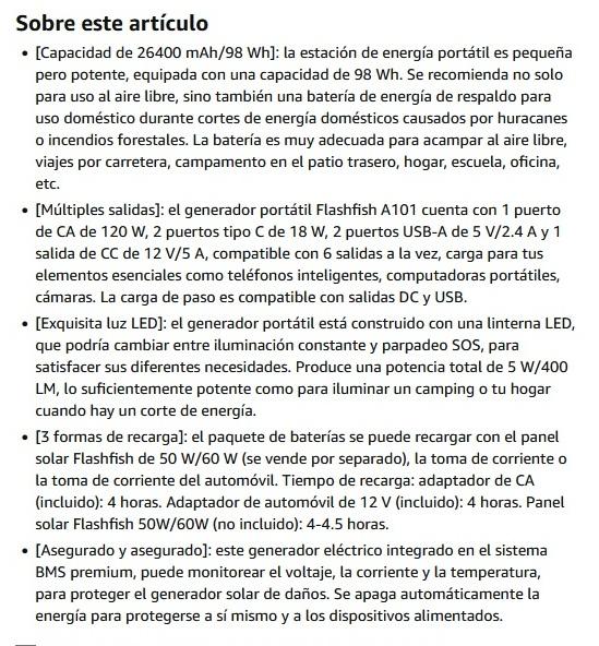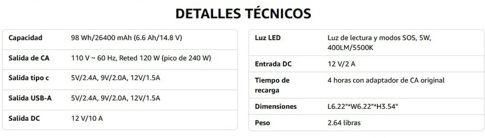 Capacidad 98Wh/26400mAh(6.6Ah/14.8V) Salida CA 110V~ 60Hz, Retenida 120W (pico 240W) Salida tipo c 5V/2.4A, 9V/2.0A, 12V/1.5A Salida USB-A 5V/2.4A, 9 V/2,0 A, 12 V/1,5 A Salida CC Luz LED de 12 V/10 A Luz de lectura y modos SOS, 5 W, 400 LM/5500 K Entrada CC 12 V/2 A Tiempo de recarga 4 horas con adaptador de CA original Dimensiones L6.22 in*W6.22 in*H3 0,54 pulgadas Peso 2,64 libras