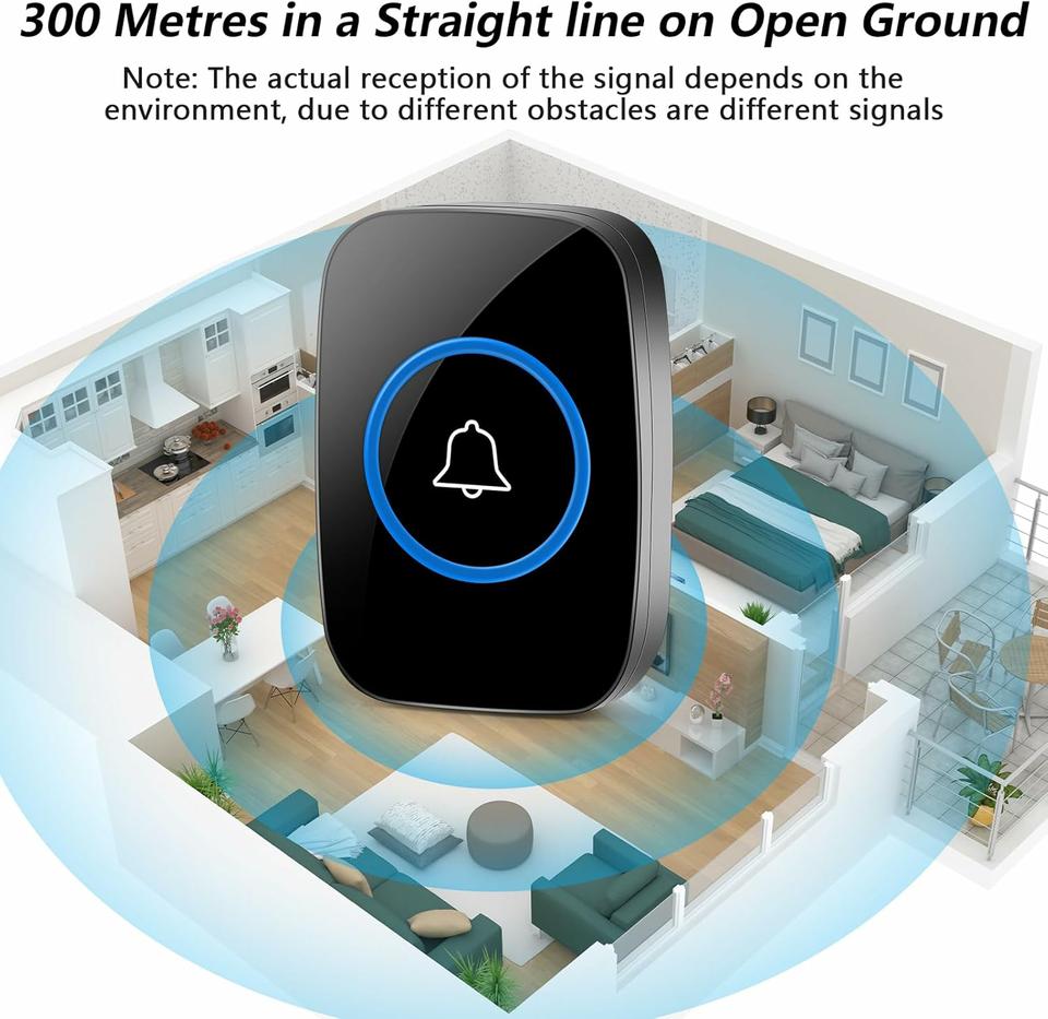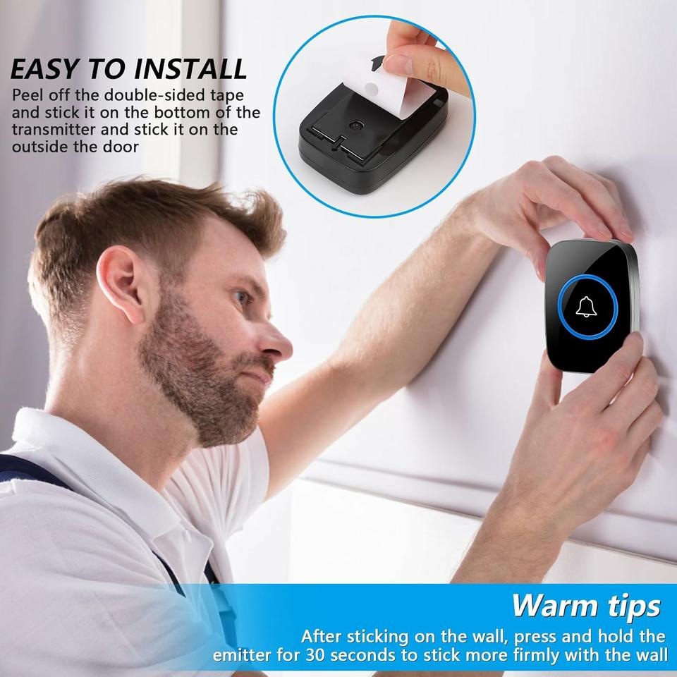 •60 Tonos de llamada y 5 Niveles de Volumen: Este timbre inalámbrico tiene 60 tonos de llamada melódicos que se pueden cambiar con sólo pulsar un botón. Timbre inalámbrico para exteriores con 5 niveles de volumen, ajustable de 0 dB (silencio) a 100 dB, que puede proporcionar un sonido alto y claro para satisfacer sus diferentes necesidades.