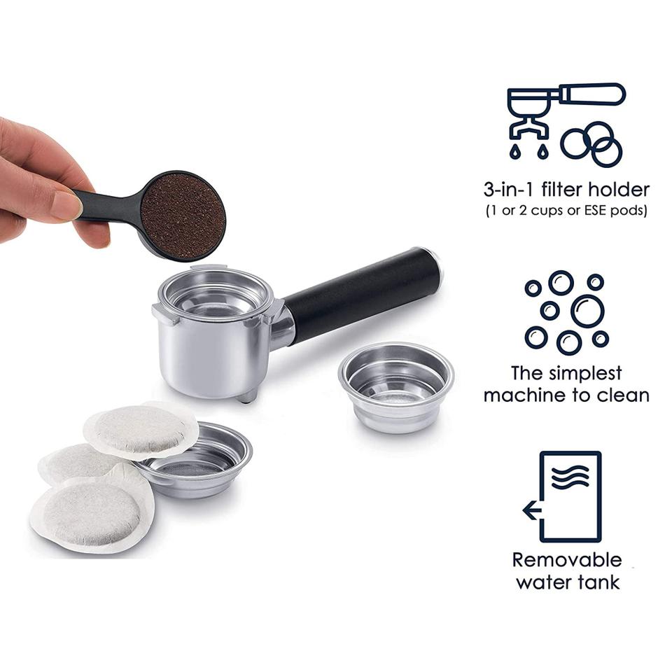 - Porta filtros 3 en 1: permite seleccionar entre una taza de espresso o dos a la vez.